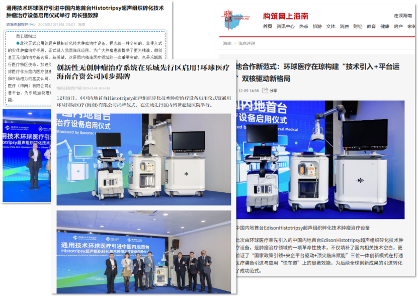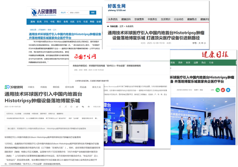 人民健康網、中國衛生網等垂直領域權威媒體,對環球醫療引入的中國大陸首臺Histotripsy超聲組織碎化技術腫瘤治療設備的臨床價值給予高度關注,評價其“將加速全球前沿醫療技術在中國的臨床應用”,為國內腫瘤診療格局帶來革新性影響。
